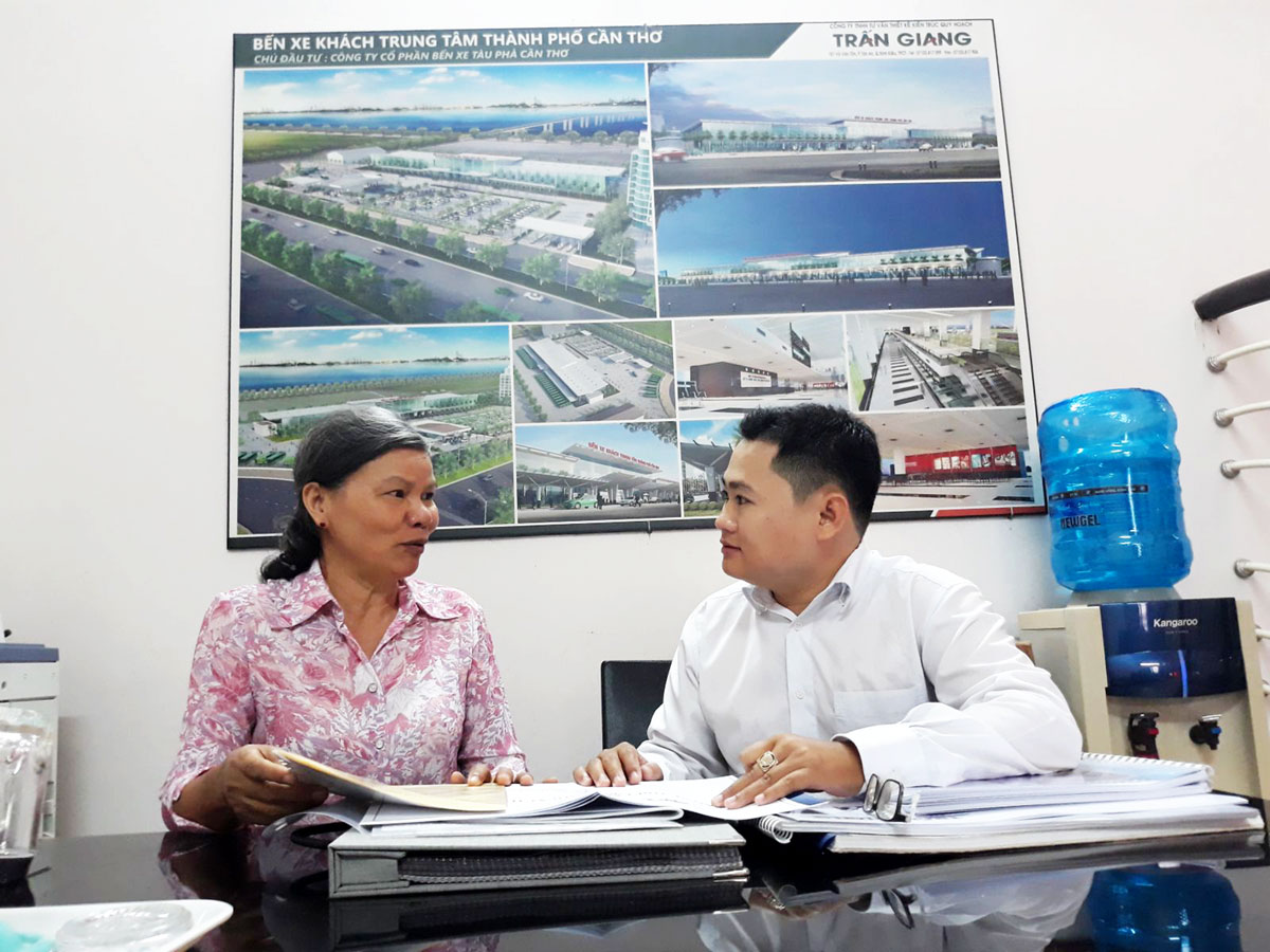Lãnh đạo Công ty TNHH Tư vấn Thiết kế Kiến trúc Quy hoạch Trấn Giang tư vấn cho khách hàng có nhu cầu thiết kế, xây dựng nhà ở.