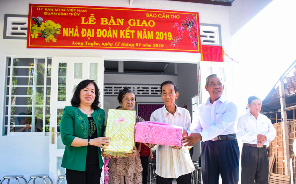(CT) - Qua 2 tháng khởi công xây dựng, sáng 17-1-2019, Đảng ủy, Ban Biên tập Báo Cần Thơ phối hợp với Ủy ban Mặt trận Tổ quốc Việt Nam (UBMTTQVN) quận Bình Thủy và phường Long Tuyền tổ chức lễ bàn giao căn nhà Đại đoàn kết cho gia đình ông Thái Tích Súng (ở khu vực Bình Thường B). Bà Phan Thị Hồng Nhung, Chủ tịch UBMTTQVN TP Cần Thơ; ông Thạch Khên, Phó Tổng Biên tập Báo Cần Thơ đến dự.