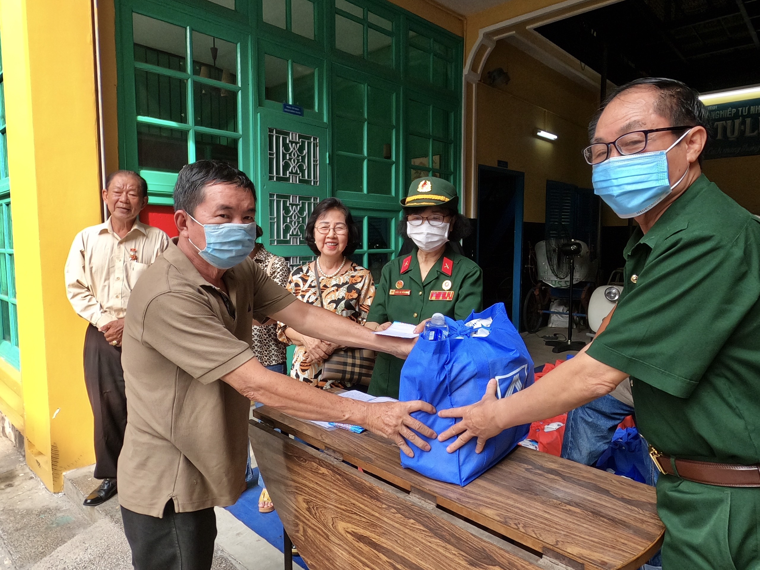 | Ông Nguyễn Quốc Độ (tay phải) Phó chủ nhiệm Câu lạc bộ truyền thống kháng chiến Khối vũ trang Biệt động Quân khu Sài Gòn - Gia Định trao quà cho bà con khó khăn. |