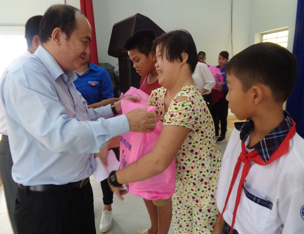 Trưởng đoàn Đại biểu Quốc hội đơn vị tỉnh Long An – Trương Văn Nọ tặng quà cho trẻ em huyện Cần Giuộc