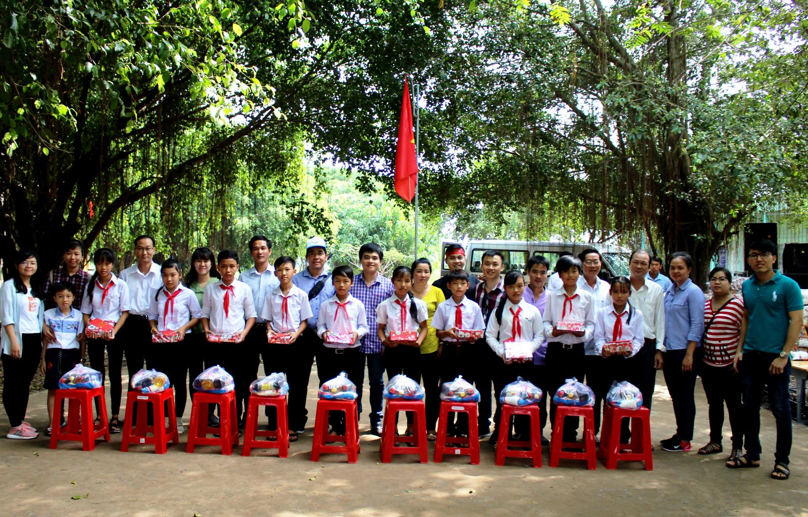 Đại diện Nhóm Hành trình thương yêu Long An tặng quà cho học sinh nghèo Trường Tiểu học và THCS Vĩnh Bửu
