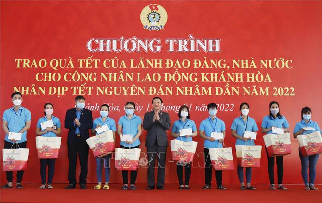 | Phó Chủ tịch Quốc hội Nguyễn Khắc Định (giữa) và Phó Chủ tịch Tổng LĐLĐ Việt Nam Phan Văn Anh trao quà cho công nhân khu công nghiệp Suối Dầu, huyện Cam Lâm (Ảnh: Phan Sáu) |