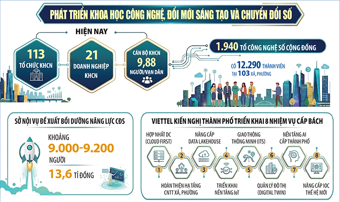 Theo Hệ thống thông tin giám sát, đánh giá việc thực hiện Nghị quyết số 57-NQ/TW của Bộ Chính trị về đột phá phát triển KHCN, ĐMST và CĐS quốc gia, đến ngày 13-4, thành phố hoàn thành 137/246 nhiệm vụ được giao; đang thực hiện đúng hạn 109 nhiệm vụ (trong đó có 81 nhiệm vụ thường xuyên).