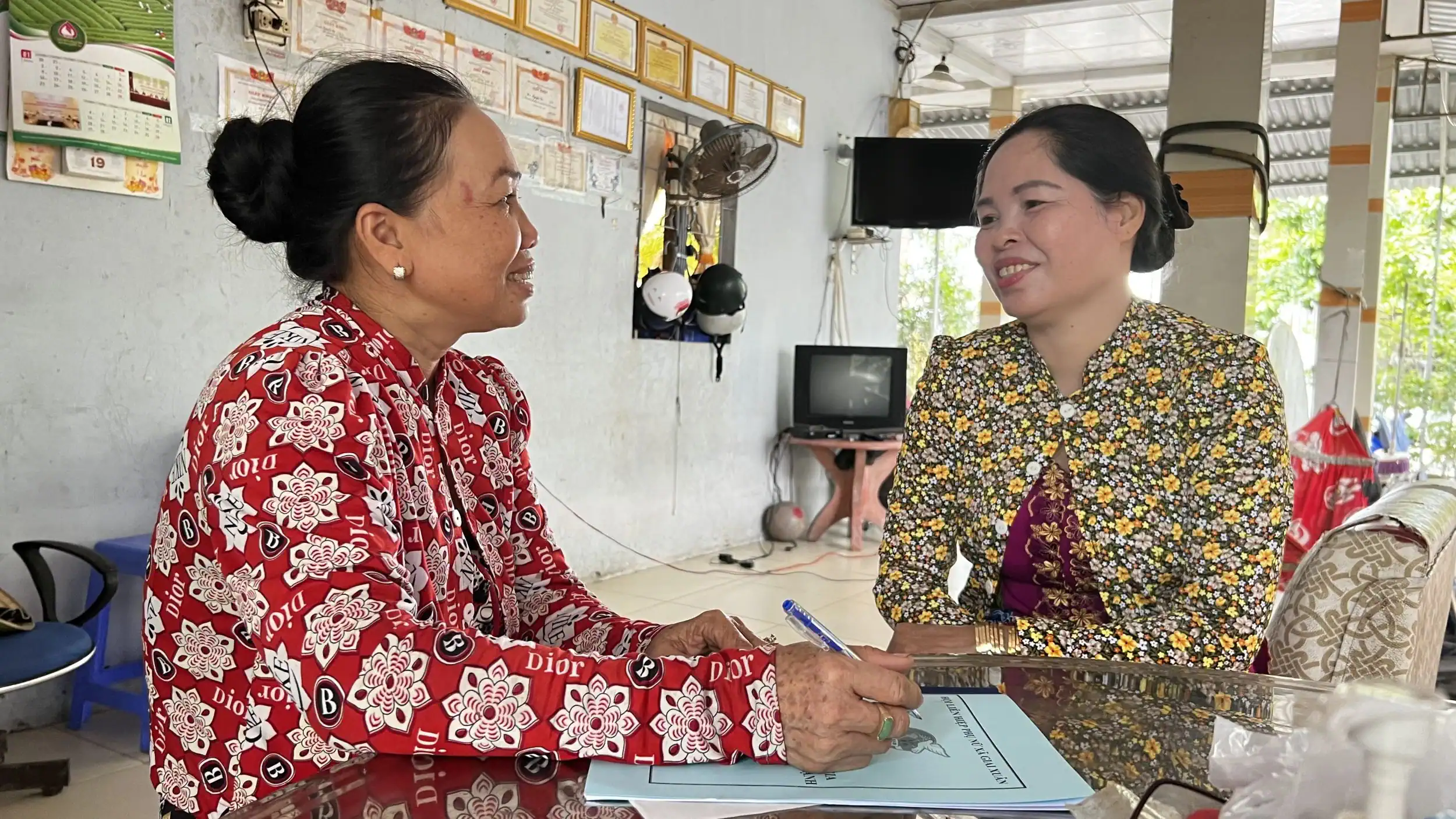 Cộng tác viên tổ chức dịch vụ thu BHXH, BHYT ở xã Giai Xuân (bên trái) tuyên truyền, vận động người dân tham gia BHXH tự nguyện, BHYT.