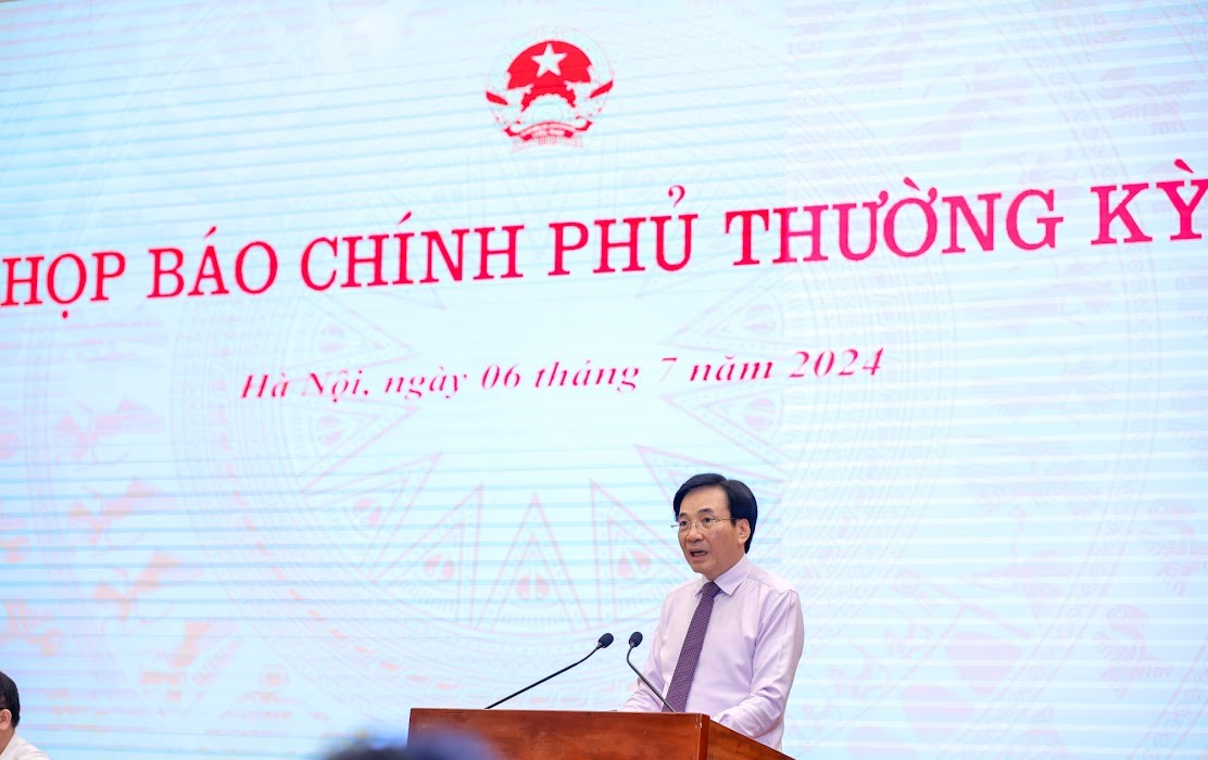 Chiều 6/7, tại Hà Nội, Văn phòng Chính phủ tổ chức họp báo Chính phủ thường kỳ tháng 6/2024, cung cấp thông tin về tình hình kinh tế - xã hội tháng 6 và 6 tháng đầu năm 2024. Bộ trưởng, Chủ nhiệm Văn phòng Chính phủ Trần Văn Sơn, Người phát ngôn của Chính phủ chủ trì buổi họp báo.