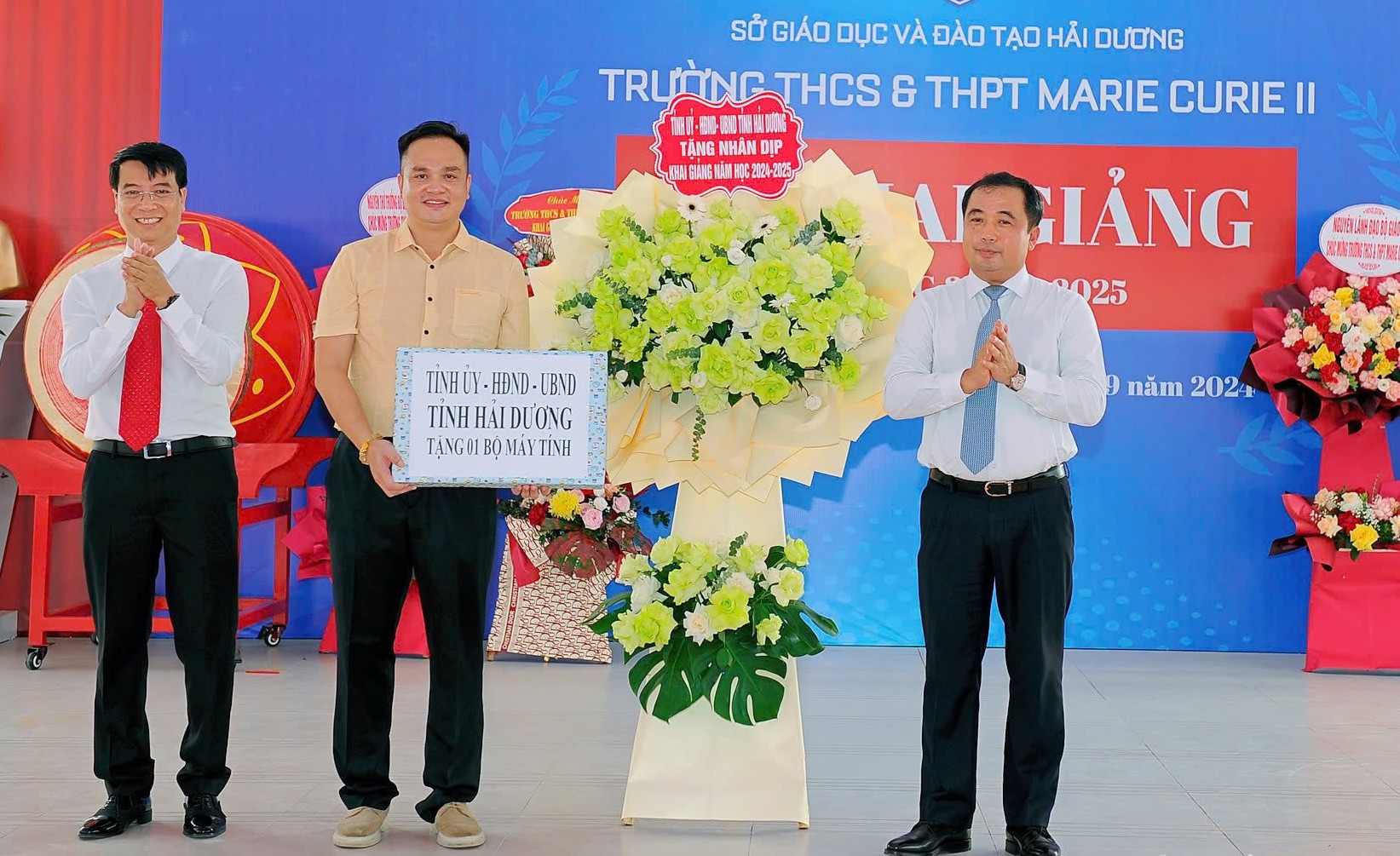 | Đồng chí Bí thư Tỉnh uỷ Hải Dương Trần Đức Thắng tặng hoa chúc mừng và trao quà cho Trường THCS & THPT Marie Curie II. |
