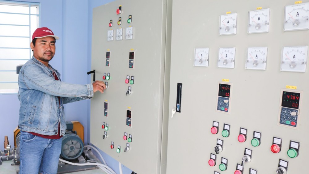 Nhân viên Trung tâm nước vận hành Hệ thống cấp nước tập trung xã Định Môn.