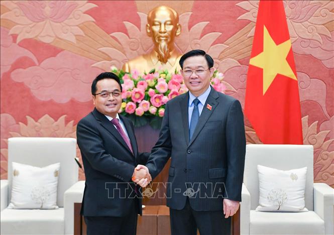 | Chủ tịch Quốc hội Vương Đình Huệ tiếp Chủ tịch Kiểm toán Nhà nước Lào Viengthavisone Thephachanh. Ảnh: TTXVN. |