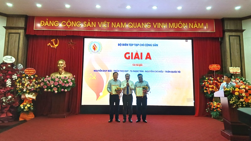 | Đồng chí Lê Hải Bình, Uỷ viên dự khuyết Ban Chấp hành Trung ương Đảng, Tổng Biên tập Tạp chí Cộng sản trao giải A cho các tác giả đoạt giải (Ảnh: Đặng Hiếu) |