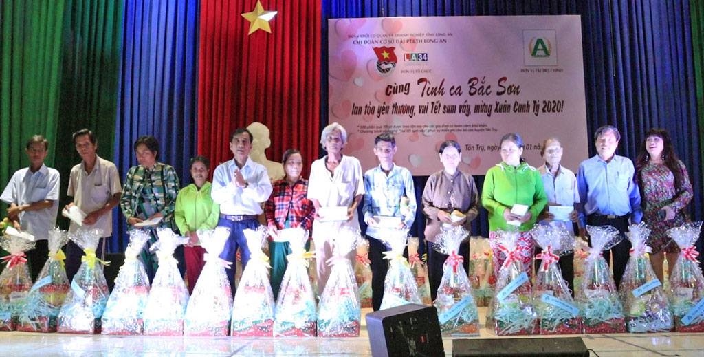 Tại đây, Tập đoàn An Nông tặng 100 phần quà cho người dân có hoàn cảnh khó khăn trên địa bàn huyện Tân Trụ. Mỗi phần quà trị giá 800 ngàn đồng, gồm nhu yếu phẩm và 200 ngàn đồng tiền mặt. Tổng giá trị quà tặng khoảng 100 triệu đồng.