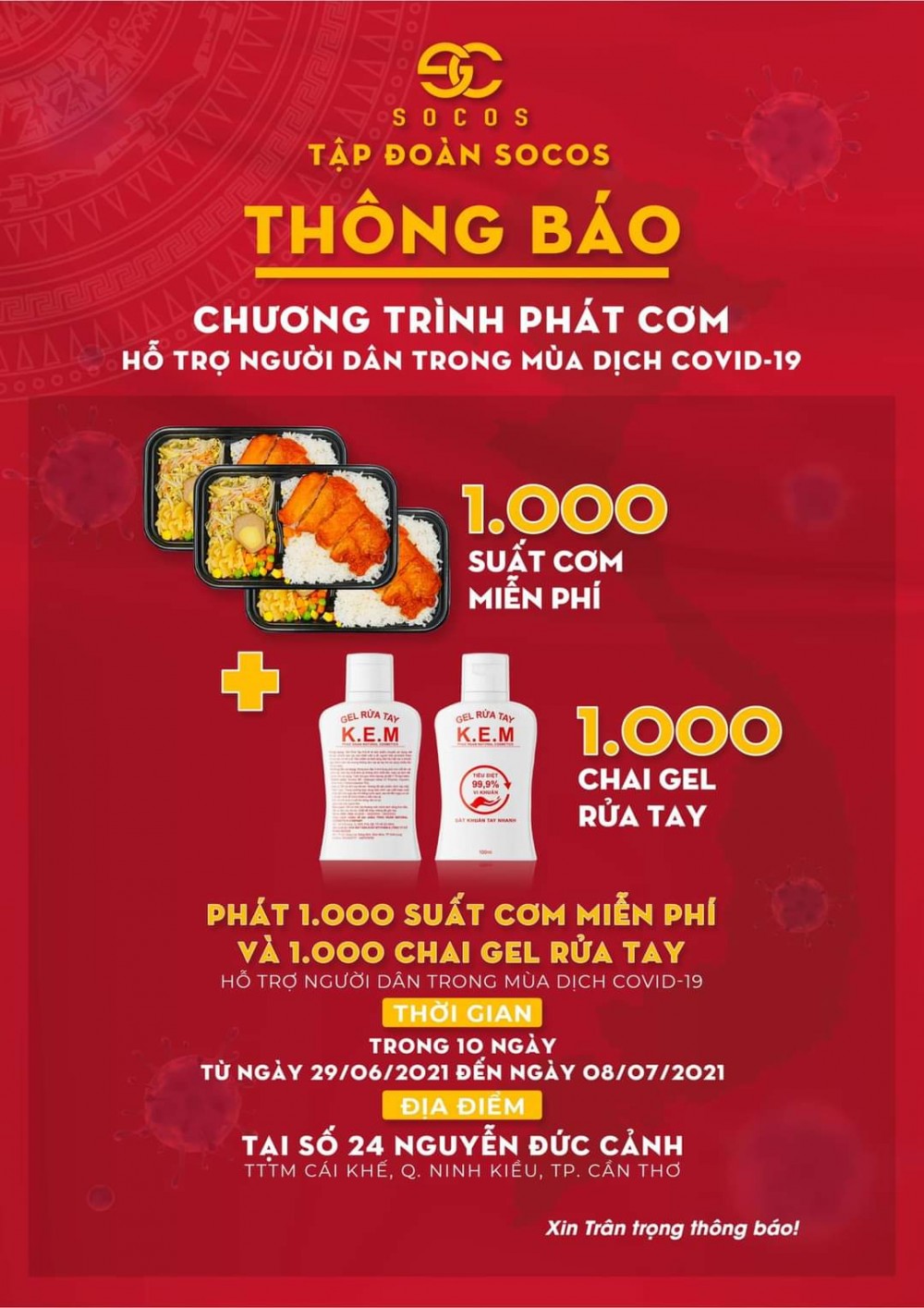 Tại số 24 Nguyễn Đức Cảnh, Trung tâm thương mại Cái Khế, Quận Ninh Kiều, thành phố Cần Thơ, cứ vào lúc 16h từ ngày 29/6/2021 đến 8/7/2021, tập đoàn SOCOS mà đại diện là bà Phạm Phúc Ngân sẽ phát 1000 suất cơm miễn phí dành tặng người nghèo gặp khó khăn do ảnh hưởng dịch Covid-19 khi bà con đến đây sẽ được nhận một phần cơm trưa đảm bảo đầy đủ dinh dưỡng.