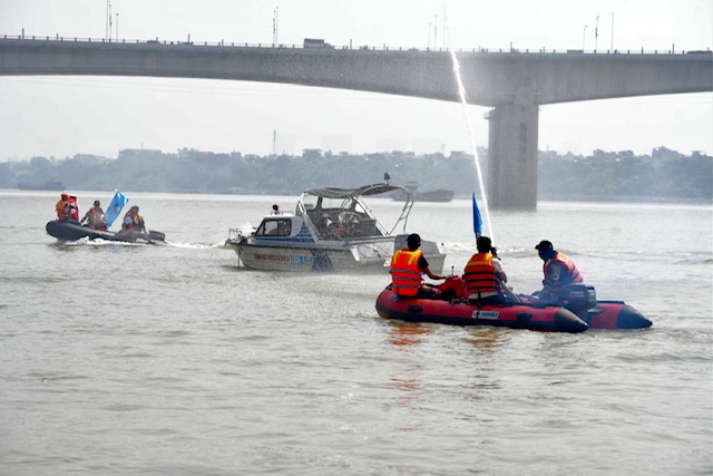 | Tình nguyện viên trực tiếp thực hành diễn tập phòng cháy, chữa cháy đường thủy |