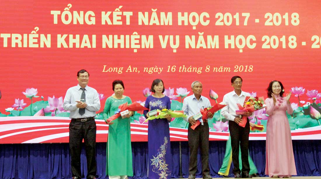 Giám đốc Sở Giáo dục và Đào tạo - Nguyễn Thanh Tiệp (bìa trái) tặng hoa, quà cho cán bộ về hưu của ngành nhân dịp tổng kết năm học