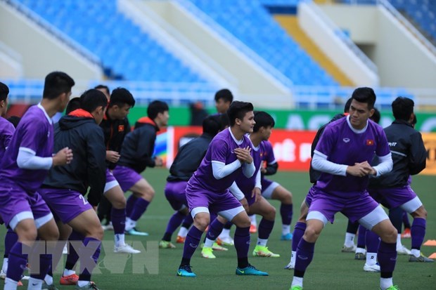 Các cầu thủ tập luyện chuẩn bị cho trận đấu. (Ảnh: Tuấn Anh/TTXVN)