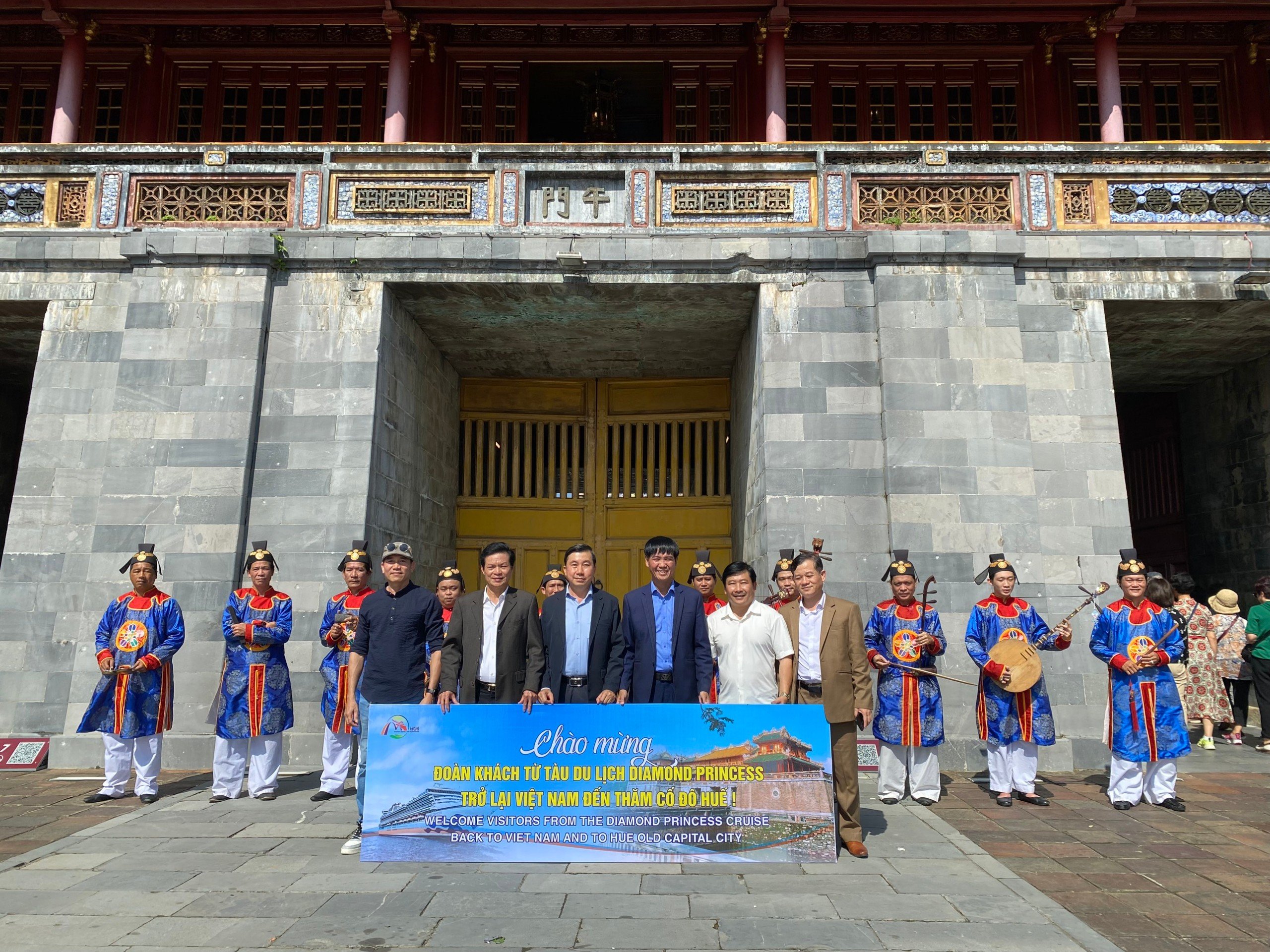 | Tại cửa Ngọ Môn (Đại nội Huế), Đại diện lãnh đạo Sở Du lịch, Hiệp hội Du lịch tỉnh và Trung tâm Bảo tồn Di tích Cố đô Huế đã chào mừng đoàn khách du lịch trên tàu Diamond Princess đi tham quan. |