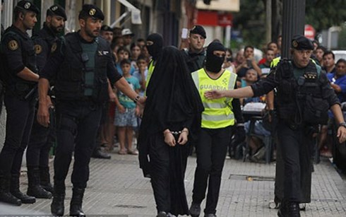 Cảnh sát Tây Ban Nha dẫn giải một thiếu nữ người Morocco mặc áo choàng Hồi giáo che kín mặt. (ảnh: Reuters)