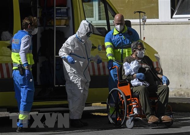Nhân viên y tế chuyển bệnh nhân nhiễm COVID-19 tới bệnh viện ở Madrid, Tây Ban Nha ngày 2/4/2020. (Ảnh: AFP/TTXVN)