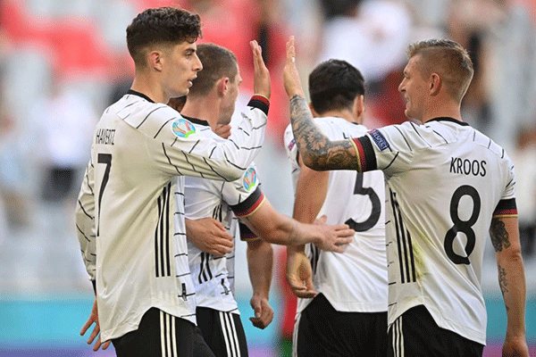 Đội tuyển Đức chiến thắng rực rỡ trước đương kim vô địch châu Âu ở lượt trận thứ 2 bảng F. Trong ảnh, cầu thủ Kai Havertz (trái) ghi bàn thắng nâng tỷ số lên 3-1 cho tuyển Đức. Ảnh: Straitstimes