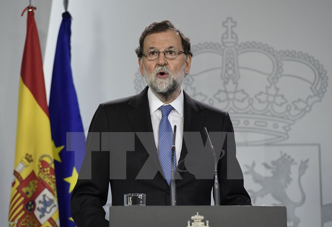 Thủ tướng Tây Ban Nha Mariano Rajoy trong cuộc họp báo ở Barcelona. (Nguồn: AFP/TTXVN)