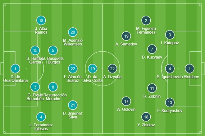 Tây Ban Nha: De Gea; Nacho, Pique, Ramos, Jordi Alba; Koke, Busquets; Silva, Isco, Asensio; Costa