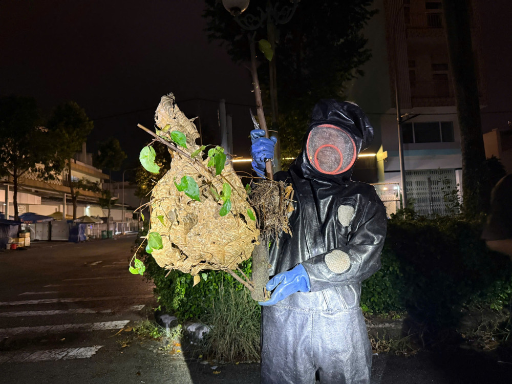 Trước đó, người dân phát hiện một tổ ong vò vẽ kích thước lớn trên cao, tiềm ẩn nguy cơ gây nguy hiểm cho khu vực xung quanh nên đã báo tin đến lực lượng chức năng.