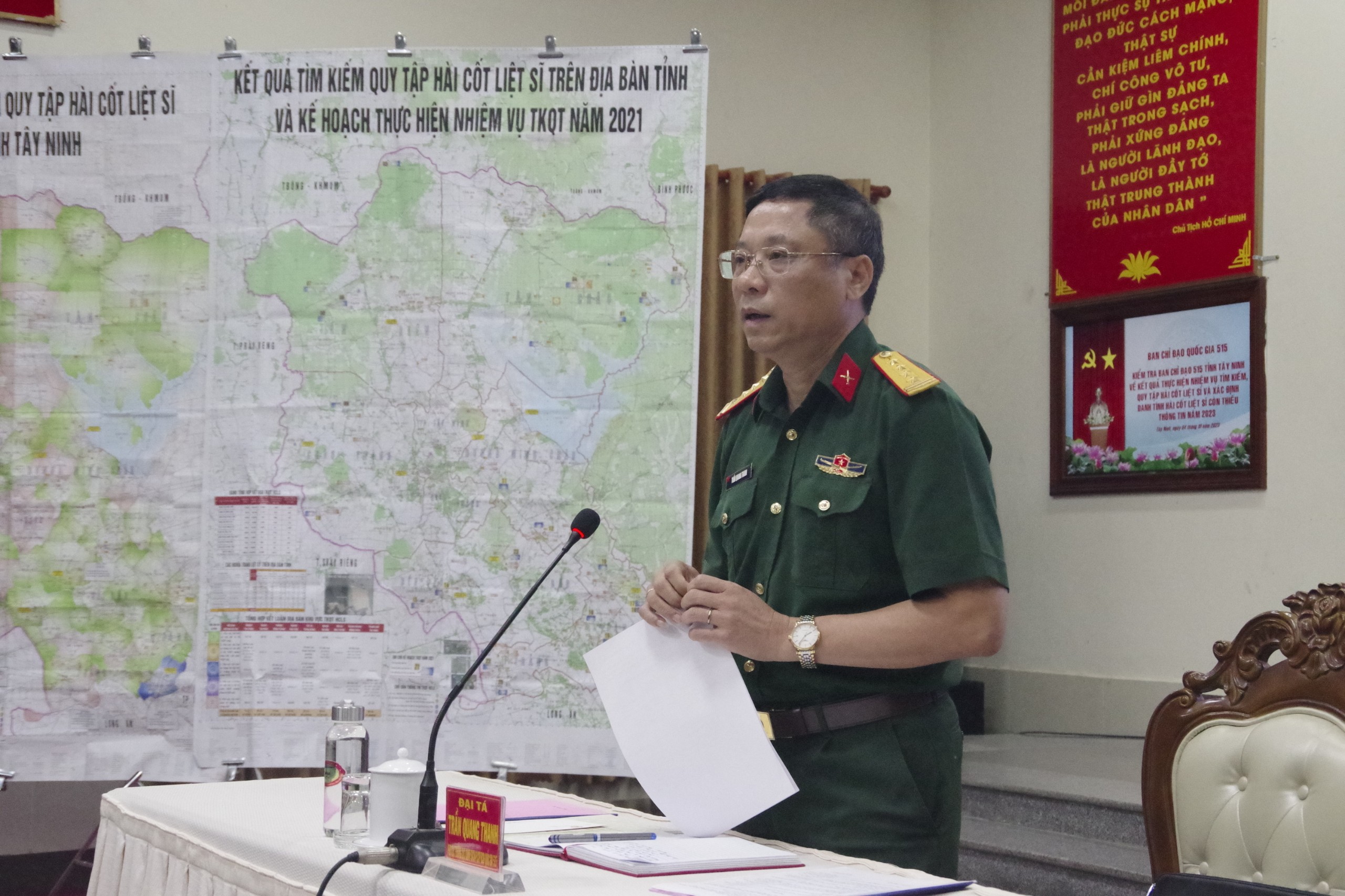 Phát biểu tại buổi làm việc, Đại tá Trần Quang Thanh- Phó Cục trưởng Cục Chính sách, Phó chánh Văn phòng Ban Chỉ đạo Quốc gia 515 đánh giá cao tỉnh Tây Ninh đã quan tâm lãnh đạo, chỉ đạo triển khai tích cực toàn diện đồng bộ đạt kết quả cao trong công tác tìm kiếm quy tập hài cốt liệt sỹ và xác định danh tính hài cốt liệt sỹ, trong đó nổi bật tổ chức kết luận địa bàn và lập bản đồ tìm kiếm, quy tập hài cốt liệt sỹ tại 542/542 ấp, khu phố; 94/94 xã, phường, thị trấn; 9/9 huyện, thị xã, thành phố (đạt 100%). Đến nay, 94/94 xã, phường, thị trấn; 9/9 huyện, thị xã, thành phố và tỉnh đã lập bản đồ tìm kiếm quy tập hài cốt liệt sỹ.