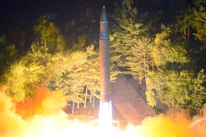 Tên lửa đạn đạo xuyên lục địa Hwasong-14 của Triều Tiên được phóng tại một địa điểm bí mật. (Nguồn: EPA/TTXVN)