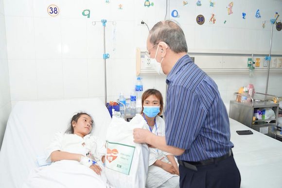 | Ông Phan Diễn - nguyên Uỷ viên Bộ Chính trị, nguyên Thường trực Ban Bí thư, Chủ tịch Qũy Cộng đồng Phòng tránh thiên tai trao quà cho các em nhỏ tại Bệnh viện Hữu nghị Việt Đức . (Ảnh: TH) |