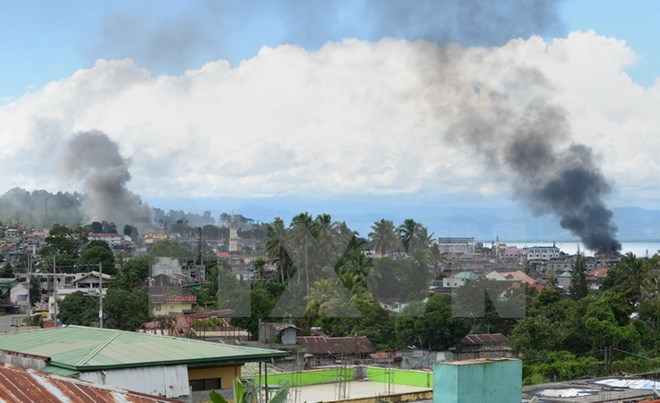 Khói bốc lên từ các địa điểm của phiến quân bị không kích ở Marawi ngày 26/6. (Nguồn: AFP/TTXVN)