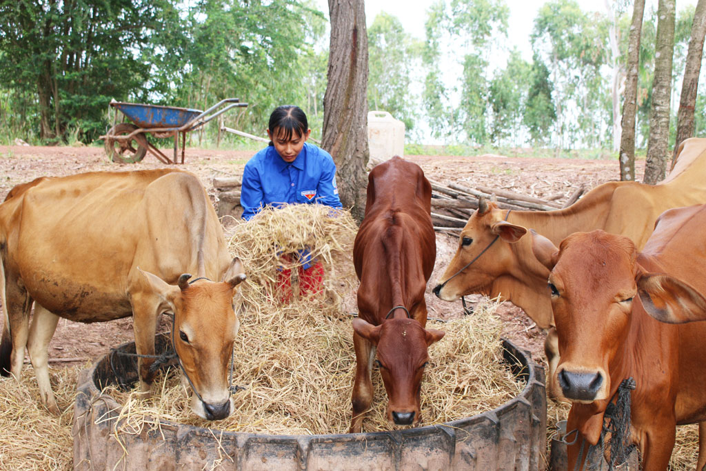 Năm 2017, bà Phạm Thị Kim Vốn, ngụ ấp Bàu Nâu, được Nhà nước hỗ trợ 1 con bò sinh sản từ Chương trình 135 và bà vay vốn mua thêm 1 con bò giống về nuôi. Để chủ động nguồn thức ăn, bà tranh thủ cắt cỏ, trộn thêm các loại phụ phẩm nông nghiệp, giúp đàn bò tăng trọng nhanh và sinh sản. Năm 2018, gia đình bà Vốn thoát nghèo và hiện sở hữu đàn bò 10 con.