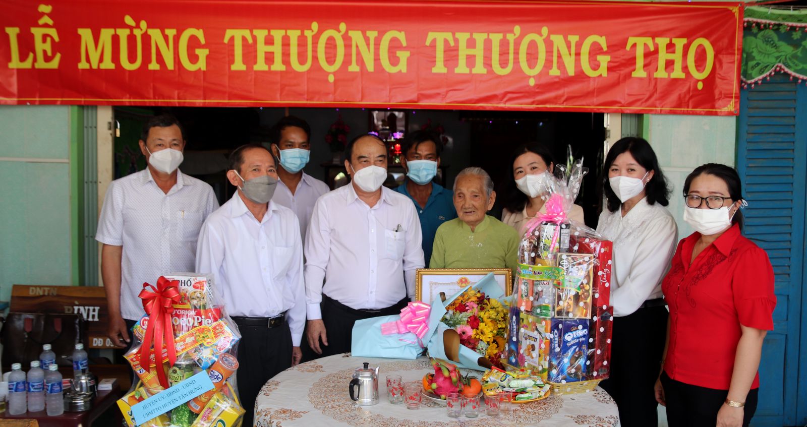 Đoàn đến thăm, tặng quà, trao bằng chúc thọ của Chủ tịch UBND tỉnh cho cụ Trần Thị Thiêu (xã Vĩnh Thạnh, huyện Tân Hưng)