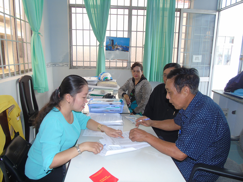 Cán bộ phụ trách lao động – thương binh và xã hội phường Lê Bình cấp phát tiền trợ cấp cho gia đình chính sách.