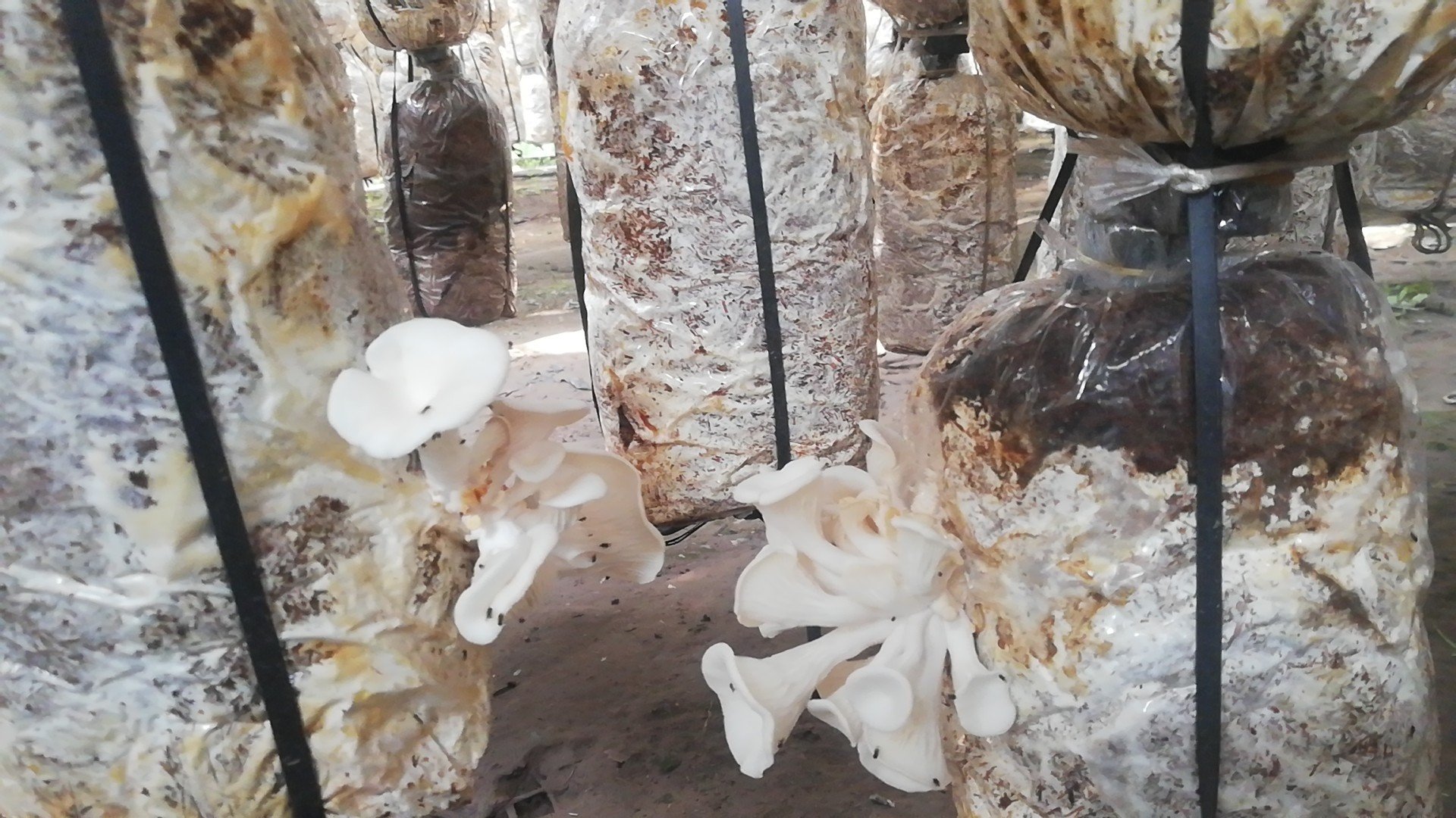 Sau khi hoàn tất 4 công đoạn trên thì đưa bịch đã cấy meo giống lên giá. Khoảng 1 tháng, phôi bắt đầu ăn trắng thì bịch phôi được gọi là đạt. Lúc đó, treo bịch phôi lên dây, chờ nấm phát triển rồi thu hoạch. Trong quá trình chăm sóc nấm, cần chú ý đến độ ẩm. Trung bình, mỗi ngày tưới nước 1 - 2 lần, tùy theo thời tiết.