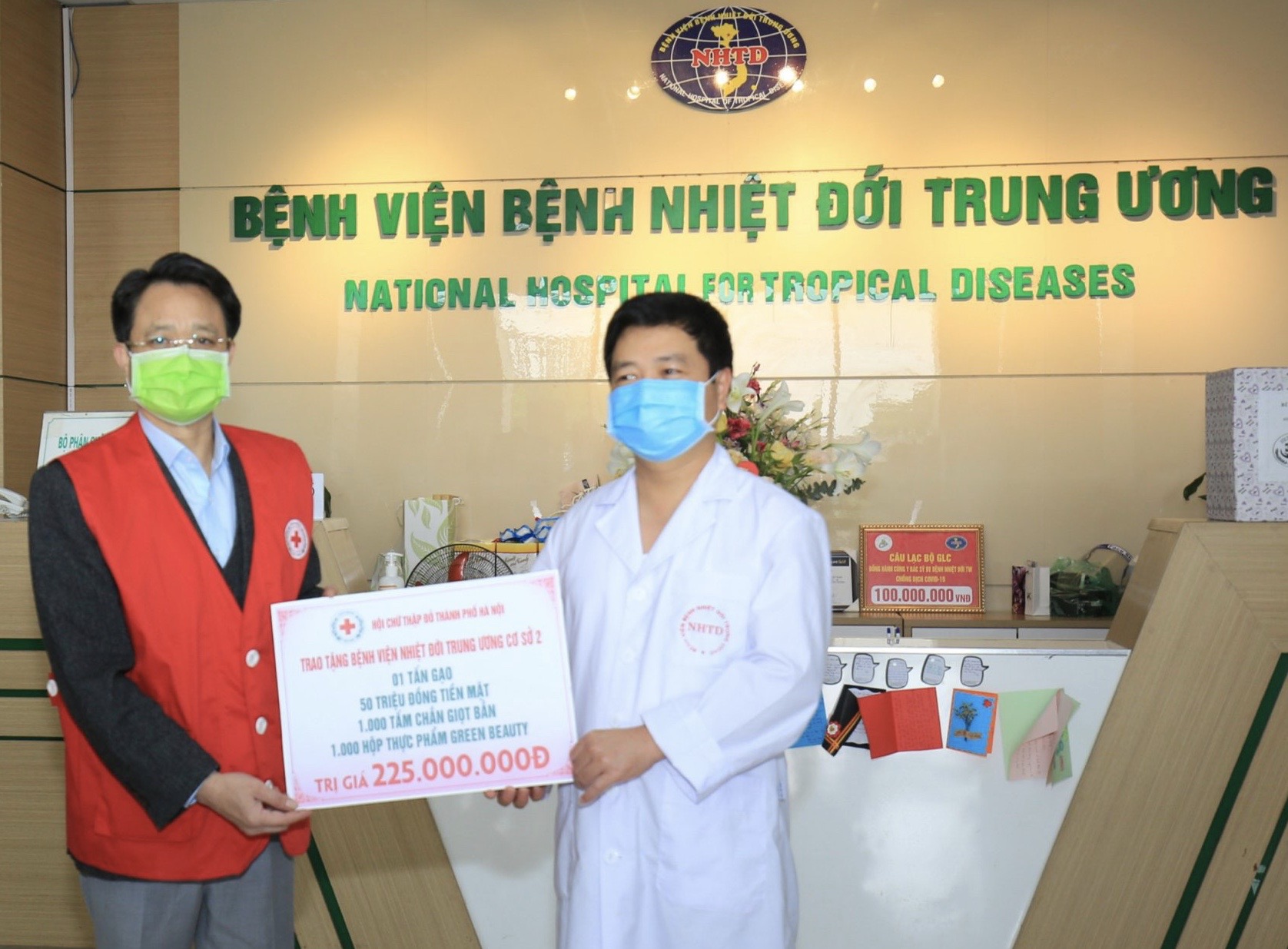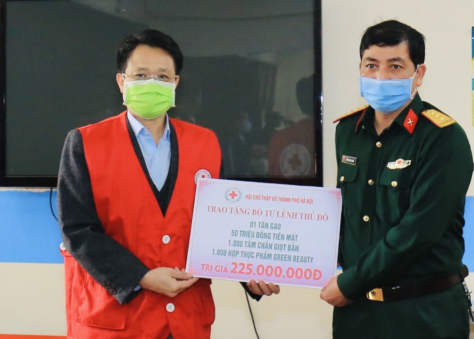 Đoàn công tác đã thăm và trao tặng các y, bác sỹ tại Bệnh viện Nhiệt đới Trung ương cơ sở 2 và các cán bộ, chiến sỹ thuộc Bộ Tư lệnh Thủ đô đang làm nhiệm vụ ở khu cách ly Đại học FPT, mỗi điểm gồm 1 tấn gạo, 1.000 tấm kính chống giọt bắn; 1.000 hộp thực phẩm Greenbeauty và 50 triệu đồng tiền mặt. Tổng trị giá trao tặng tại hai địa điểm là 450 triệu đồng.