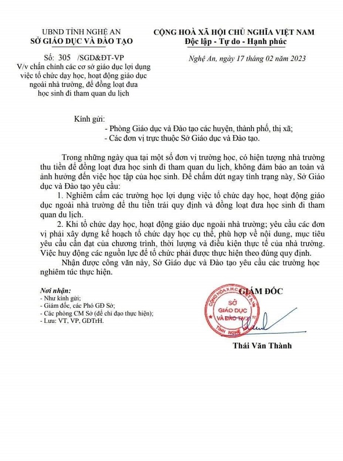 Thực tế, không chỉ riêng Nghệ An mà những năm qua, cơ quan chức năng nhiều địa phương đã ban hành các văn bản quy định, chấn chỉnh hoạt động tham quan, trải nghiệm của các cơ sở giáo dục. Để hoạt động tham quan, trải nghiệm cho học sinh thực sự an toàn, hiệu quả, vấn đề quan trọng hàng đầu là các nhà trường không tổ chức cho học sinh đi tham quan trải nghiệm dài ngày với chi phí lớn, ở các địa điểm có nhiều nguy cơ mất an toàn. Nên tổ chức tham quan, trải nghiệm gắn với các khu di tích lịch sử, các “địa chỉ đỏ”, các địa điểm ở gần nhà trường. Việc tổ chức cần phù hợp với lứa tuổi, đối tượng tham gia và phải được thống nhất, đồng thuận của phụ huynh học sinh.