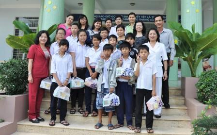 Thầy và trò Trường Nuôi dạy trẻ khuyết tật chụp ảnh lưu niệm với BGĐ Công ty Cổ phần May xuất khẩu Long An