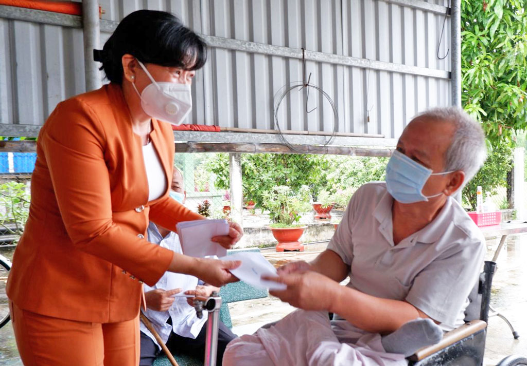Giám đốc Sở Lao động - Thương binh và Xã hội - Nguyễn Hồng Mai tặng quà cho thương binh nặng ở xã Nhị Thành, huyện Thủ Thừa