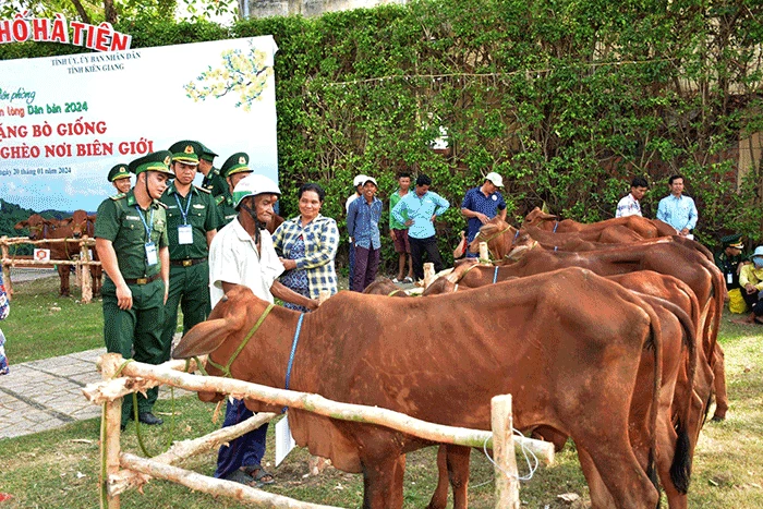 Người dân nghèo khu vực biên giới tỉnh Kiên Giang được tặng bò giống từ Chương trình “Xuân Biên phòng ấm lòng dân bản”.