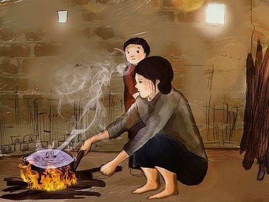 Tháng tám nhớ những bữa cơm đẫm mùi khói, mưa tầm tã, củi ngấm nước, chẳng bén lửa. Chái bếp nhỏ xíu vỏn vẹn mấy mét vuông, nước tí tách nhỏ giọt. Mẹ phồng căng má thổi lửa, mong cho lửa cháy mà nó cứ liu riu đến bất lực. Cơm canh nấu bằng củi ướt khói hăng nồng sao mà thương quá đỗi. Bữa cơm đạm bạc chỉ có rau vườn nhà, dăm ba con cá vớt dưới ao, vậy mà chứa chan hơi ấm tình thân.