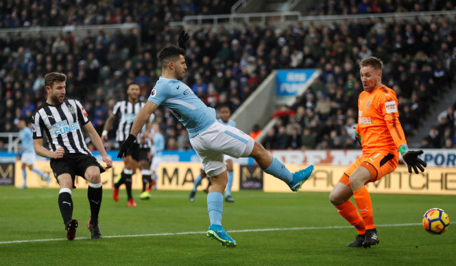 Pha dứt điểm trúng cột dọc khung thành Newcastle của Aguero. Ảnh: Reuters