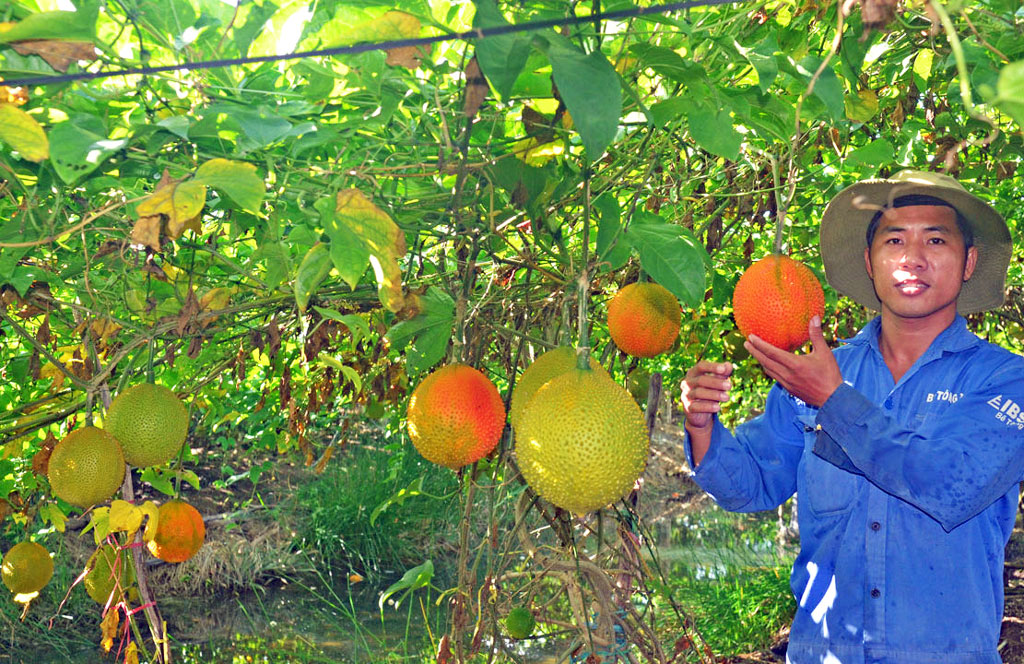 Mỗi liếp, anh Trung trồng 2 hàng gấc và lắp 2 ống dẫn nước chạy song song để tưới mỗi ngày. Anh còn làm trụ bêtông, kéo dây cước làm giàn leo cho dây gấc. Từ lúc trồng đến khi thu hoạch lần đầu khoảng 6 tháng. Mỗi năm, anh thu hoạch 23 tấn trái, bán giá thấp nhất 8.000 đồng/kg, cao nhất 28.000 đồng/kg nên thu nhập ổn định. Thấy hiệu quả, anh tiếp tục đầu tư thêm 0,8ha trồng gấc.