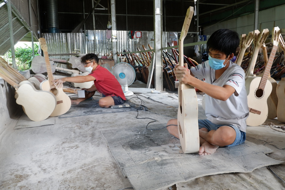 Ở cơ sở gia công sơn đàn của anh Đào Văn Tươi (ấp Thuận Tây 1, xã Thuận Thành, huyện Cần Giuộc, tỉnh Long An) có hàng chục công nhân đang miệt mài bên hàng trăm cây đàn guitar. Mỗi người một công đoạn, tất cả cùng nhau mang đến vẻ đẹp cho cây đàn guitar.