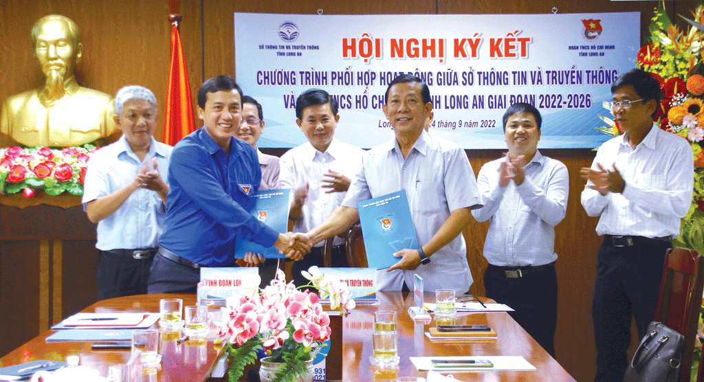 Giám đốc Sở Thông tin và Truyền thông - Nguyễn Bá Luân và Bí thư Tỉnh Đoàn - Trần Hải Phú ký kết chương trình phối hợp các hoạt động thúc đẩy thực hiện chuyển đổi số