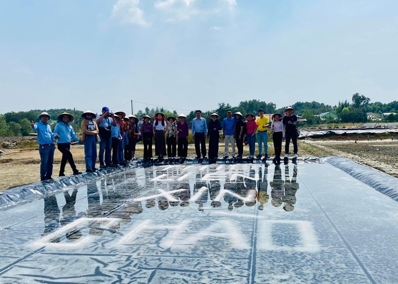 | Du khách được tìm hiểu về quy trình làm muối của người dân ấp đảo Thiềng Liềng, và trải nghiệm một số thao tác cơ bản. (Ảnh: Hoàng Mẫn) |