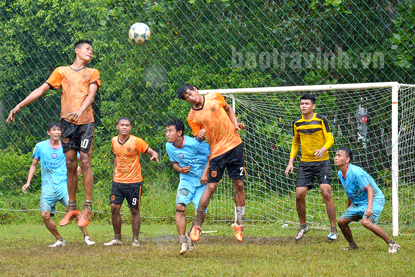 Pha uy hiếp khung thành đội Cầu Ngang của các cấu thủ đội thành phố Trà Vinh (áo cam) trong trận chung kết.