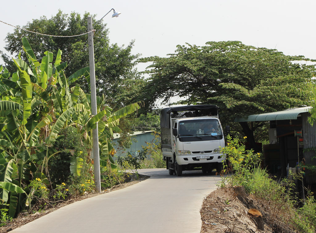 100% đường xã được nhựa hóa, bêtông hóa với bề rộng mặt đường 3,5-4m, có đèn đường thắp sáng (Trong ảnh: Đoạn đường thuộc ấp Phú Tây A)