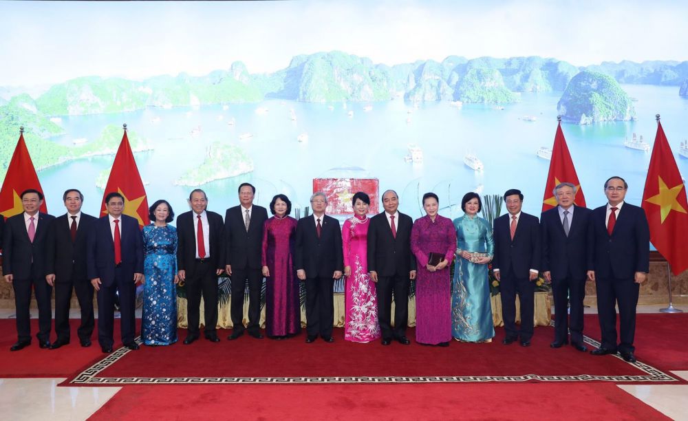 | Thủ tướng Nguyễn Xuân Phúc, Chủ tịch Quốc hội Nguyễn Thị Kim Ngân và các đồng chí lãnh đạo Đảng, Nhà nước. Ảnh: baoquocte.vn. |