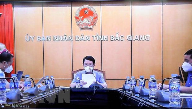 Điểm cầu tỉnh Bắc Giang tại cuộc họp trực tuyến. (Ảnh: Phạm Kiên/TTXVN)