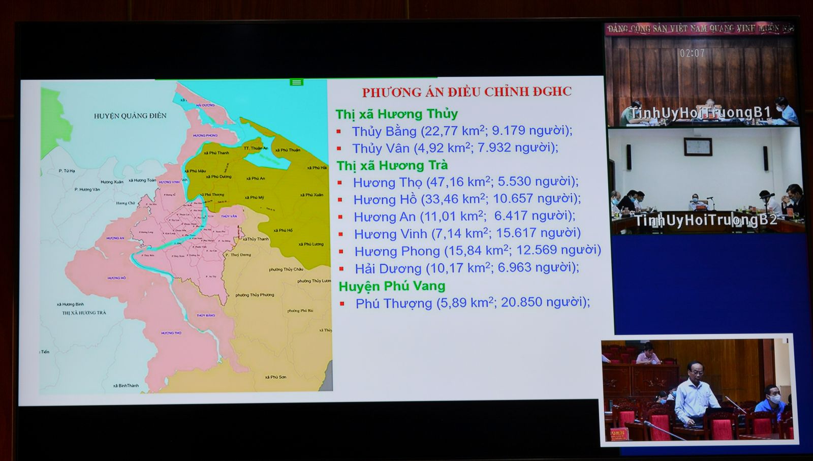 Cụ thể, Phó Giám đốc phụ trách Sở Xây dựng Nguyễn Đại Viên trình bày tóm tắt đề án, chương trình phát triển đô thị tỉnh Thừa Thiên Huế đến năm 2025 và định hướng đến năm 2030; Giám đốc Sở Nội vụ Bạch Chơn Đông trình bày tóm tắt đề án điều chỉnh địa giới hành chính để mở rộng thành phố Huế và sắp xếp, thành lập các phường thuộc thành phố Huế; Giám đốc Sở Kế hoạch và Đầu tư Nguyễn Đại Vui trình bày tóm tắt đề án xây dựng Thừa Thiên Huế trở thành thành phố trực thuộc Trung ương.