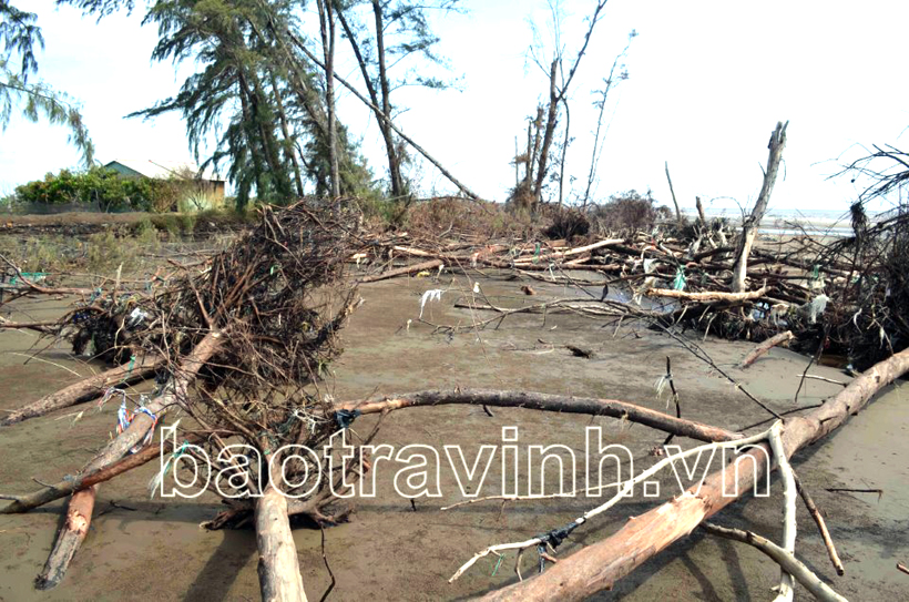 Nước biển xâm thực bờ biển thiệt hại hoàn toàn rừng phi lao phòng hộ ven biểu khu vực ấp Hồ Thùng, xã Đông Hải.